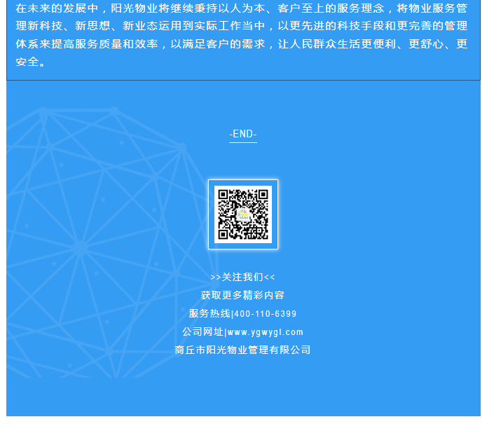 陽光物業(yè)成立于2003年5月,專注物業(yè)服務行業(yè)20余載,陽光物業(yè)現(xiàn)為河南省物業(yè)管理協(xié)會副會長單位、商丘市物業(yè)管理協(xié)會副會長單位,公司注冊資金1020萬元,陽光物業(yè)連續(xù)多年被河南省及商丘市評為先進企業(yè)、優(yōu)秀企業(yè)。