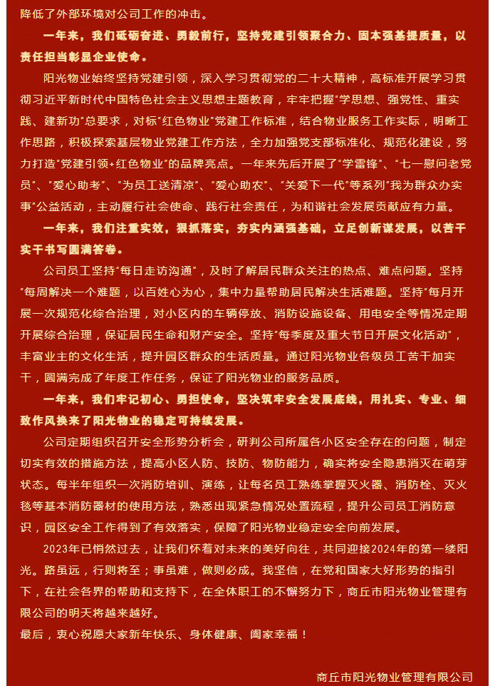 陽光物業(yè)成立于2003年5月,專注物業(yè)服務(wù)行業(yè)20余載,陽光物業(yè)現(xiàn)為河南省物業(yè)管理協(xié)會(huì)副會(huì)長(zhǎng)單位、商丘市物業(yè)管理協(xié)會(huì)副會(huì)長(zhǎng)單位,公司注冊(cè)資金1020萬元,陽光物業(yè)連續(xù)多年被河南省及商丘市評(píng)為先進(jìn)企業(yè)、優(yōu)秀企業(yè)。