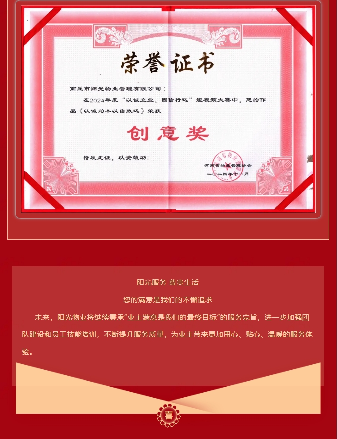 喜報(bào)|熱烈祝賀商丘市陽(yáng)光物業(yè)管理有限公司再獲佳績(jī)